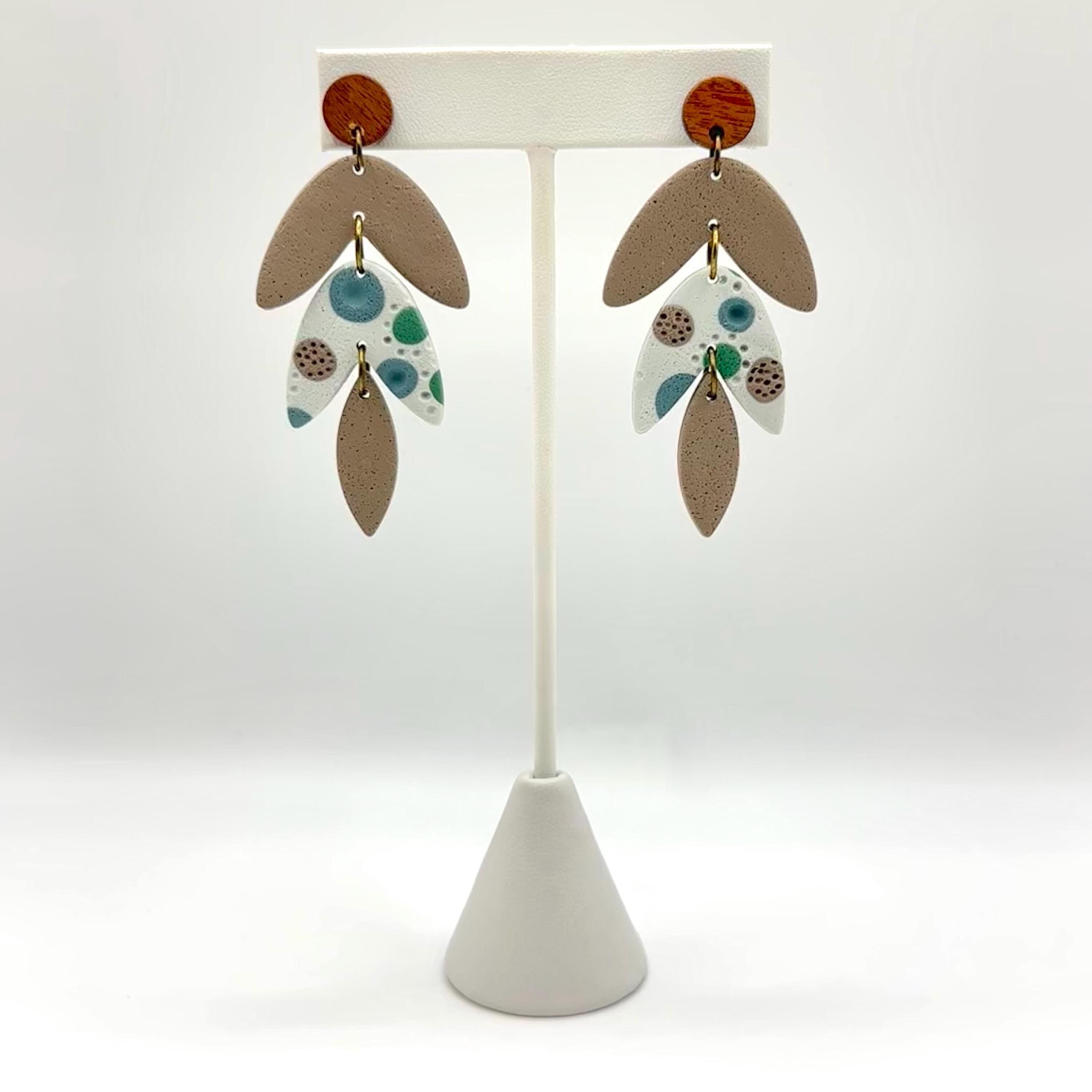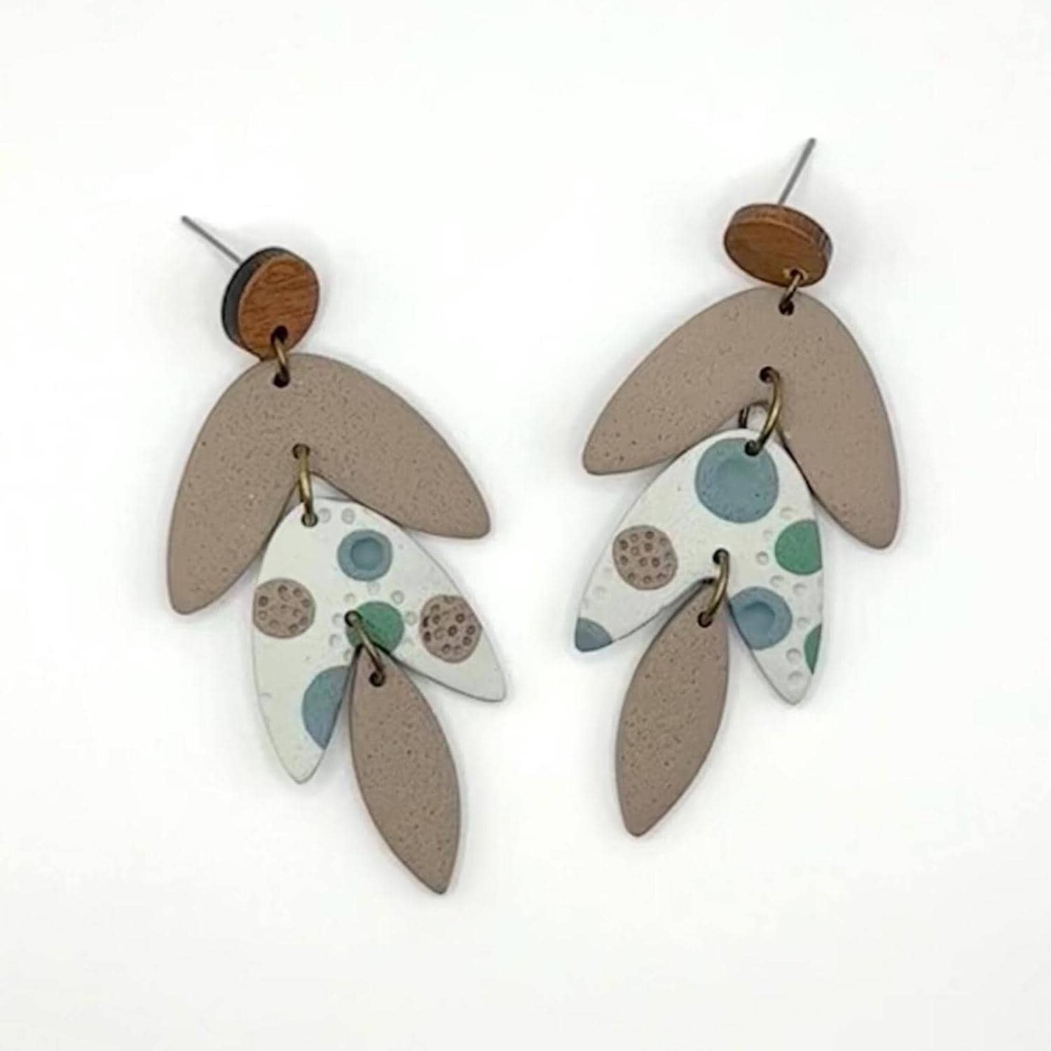 Step into a world where earthy boho elegance meets playful artistry with these handcrafted earrings by Siren Ray. Each piece is a celebration of organic textures and modern shapes—a harmonious blend of soft taupe, rich wood tones, and whimsical blue and brown patterns that dance across the ceramic-like surfaces.